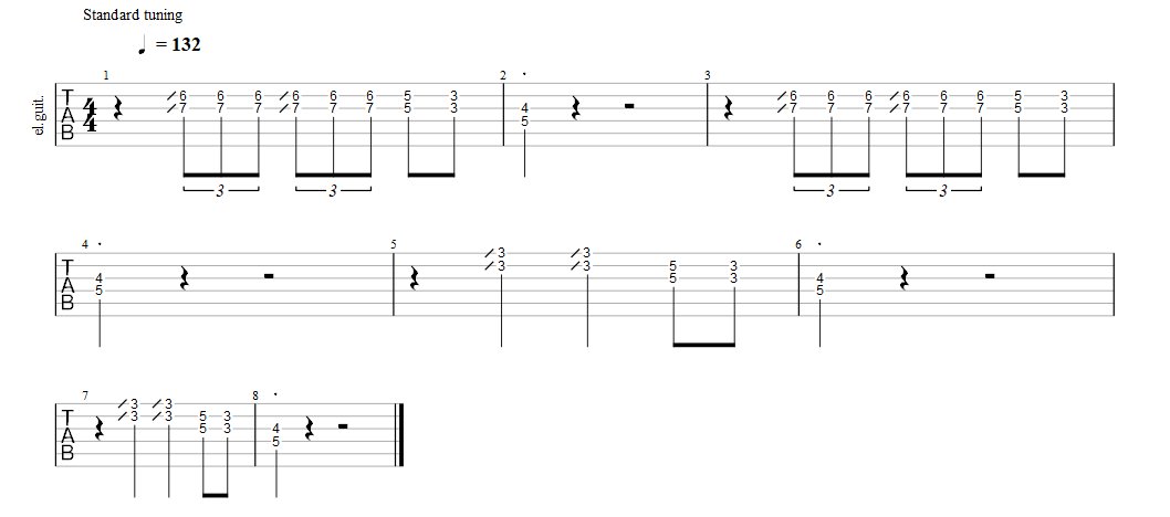 In maat 3 is er een slide omhoog van de 5e fret naar de 12e fret (E snaar), en vervolgens een slide omlaag van de 15e fret naar 12e fret (A snaar).