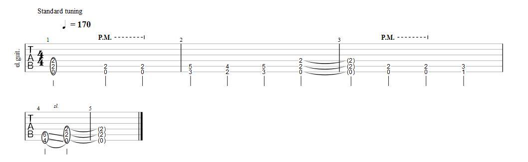 Dit wordt aangegeven met P.M. boven de tablatuur balk, hetzelfde als met let ring.